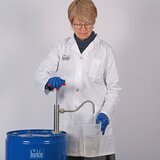 Fasspumpe für Lösemittel mit Auslaufschlauch und Absperrhahn aus Edelstahl/PTFE.