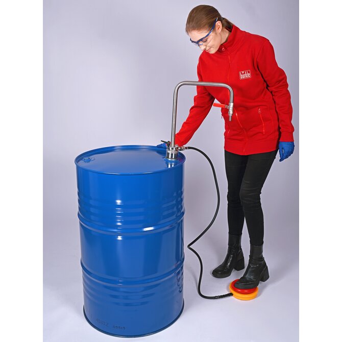 Die massive und langlebige Industrieausführung der Lösemittelpumpe stellt eine lange Lebensdauer sicher. Die Pumpe arbeitet nach dem Überdruckprinzip. Mit dem Fußbalg wird ein Überdruck im Behälter aufgebaut, der die Flüssigkeit aus dem Gebinde herausdrückt. Durch die einfache Bedienung der Pumpe mit dem Fußbalg bleiben beide Hände zum Abfüllen frei. Mit dem praktischen Clip-Anschluss kann der Luftschlauch schnell und einfach an- und abgesteckt werden.