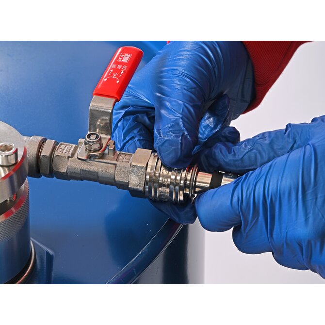 Durch die Fassverschraubung und die beiden Absperrhähne können das Gebinde und die Pumpe hermetisch verschlossen werden. Somit können nach dem Abfüllen keine unerwünschten Dämpfe entweichen. Auf diese Weise werden Gesundheit und Umwelt geschützt.
