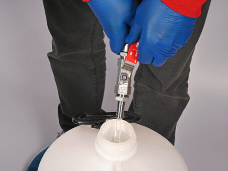 Die Handpumpe arbeitet nach dem Überdruckprinzip. Mit dem Pumpenball wird ein Überdruck im Behälter aufgebaut, der die Flüssigkeit aus dem Gebinde herausdrückt.