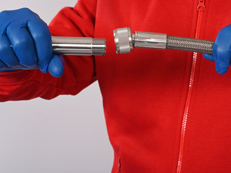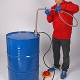 Fasspumpe für Lösemittel mit Auslaufschlauch und Absperrhahn aus Edelstahl/PTFE.