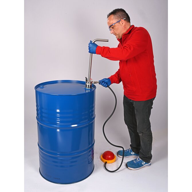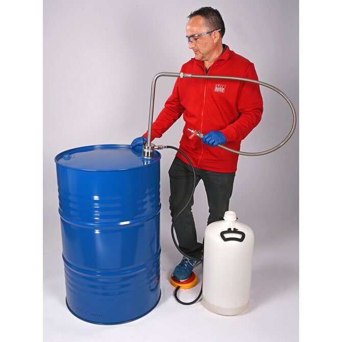 Die massive und langlebige Industrieausführung der Lösemittelpumpe stellt eine lange Lebensdauer sicher. Die Pumpe arbeitet nach dem Überdruckprinzip. Mit dem Fußbalg wird ein Überdruck im Behälter aufgebaut, der die Flüssigkeit aus dem Gebinde herausdrückt. Durch die einfache Bedienung der Pumpe mit dem Fußbalg bleiben beide Hände zum Abfüllen frei. Mit dem praktischen Clip-Anschluss kann der Luftschlauch schnell und einfach an- und abgesteckt werden.