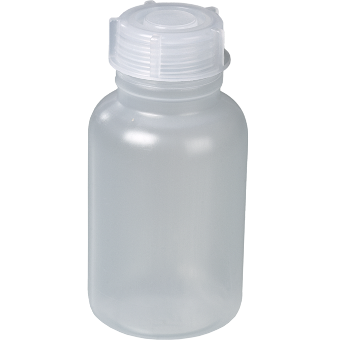 Die Weithalsflasche aus PP ist chemisch hochbeständig und unempfindlich gegenüber Stößen und Stürzen. Außerdem ist die Flasche lebensmittelecht und autoklavierbar.