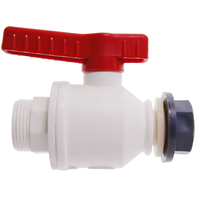 Σφαιρική βαλβίδα από PP με εξωτερικό σπείρωμα, ενισχυμένη με ίνες γυαλιού, μπάλα από PP, λαβή με δακτύλιο Ο από NBR που είναι ασφαλές για τρόφιμα και σφράγιση από EPDM.