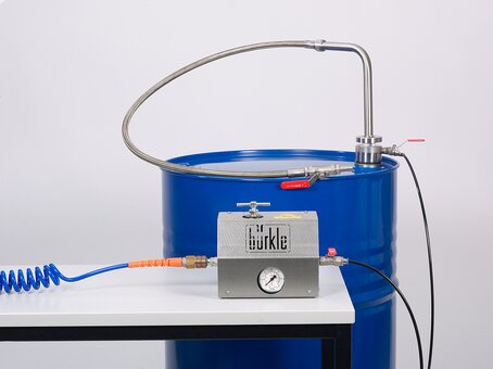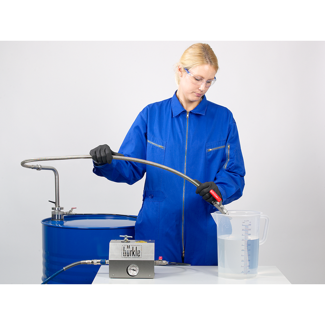 Χειροκίνητη αντλία διαλυτών για την απομάκρυνση οργανικών διαλυτών και αρωματικών ουσιών χωρίς ρύπανση. Η χειροκίνητη αντλία λειτουργεί σύμφωνα με την αρχή της υπερπίεσης. Με τη σφαίρα της αντλίας δημιουργείται υπερπίεση στο δοχείο, η οποία εξαναγκάζει το υγρό να βγει από το δοχείο.