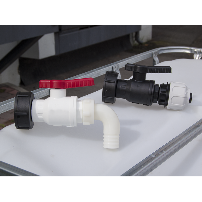 The IBC discharge valve is a sturdy, high-quality ball valve with a hose connection and connection adapter including seal, for standard thread S 60x6 external or 1" external, designed to fit all commonly used European IBC containers.