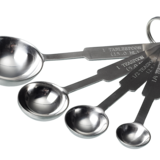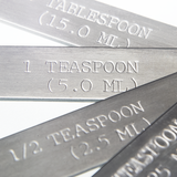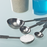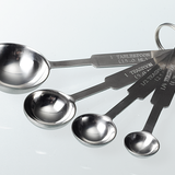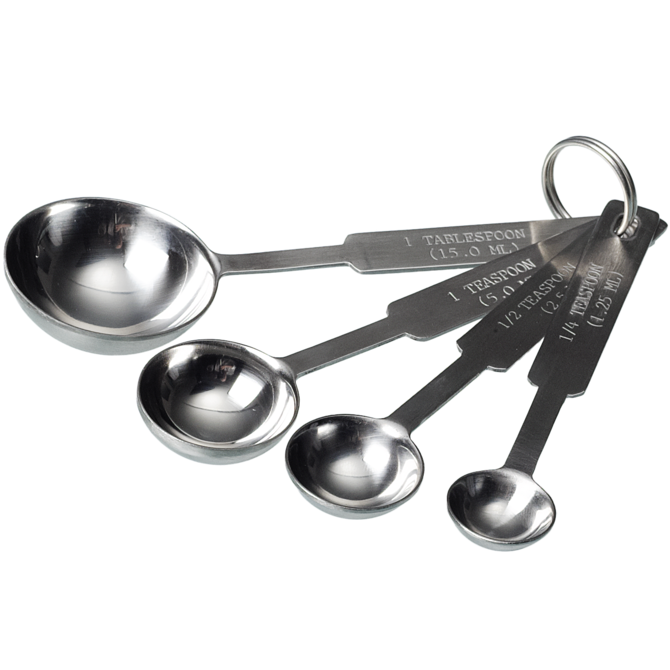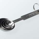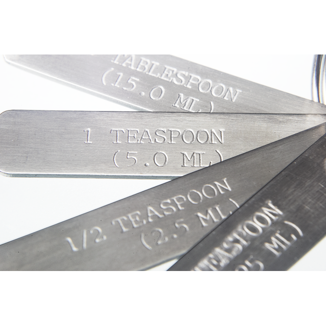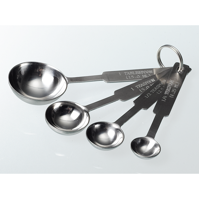 Stainless steel measuring spoon in a set of 4, as a measuring aid for fast and easy measuring from 1.25 to 15 ml. The volume is engraved on the handle of each measuring spoon.