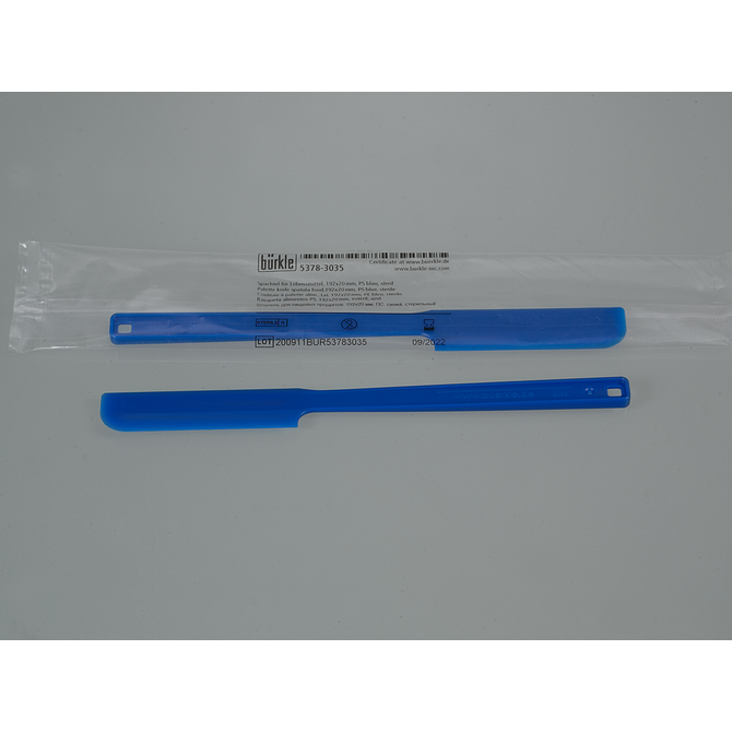 The sampling palette knife spatula can be used to apply, distribute or evenly spread viscous media such as pastes and creams. The palette knife spatula reaches easily into the corners and curves of various containers and is suitable for scraping out bowls, removing residue or wiping off Bürkle's volumetric and dosing spoons.