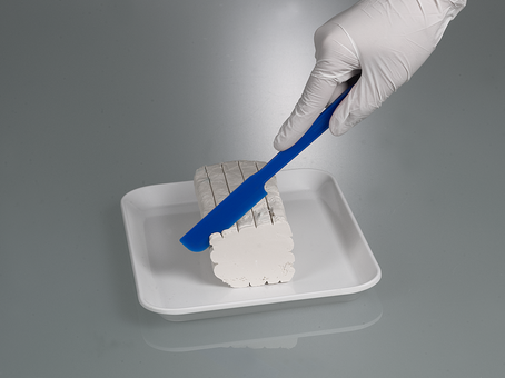 The SteriPlast® spatula for foodstuffs, made of polystyrene, is produced in our class 7 clean room (10,000), individually packaged for disposable use and then sterilised by gamma rays.