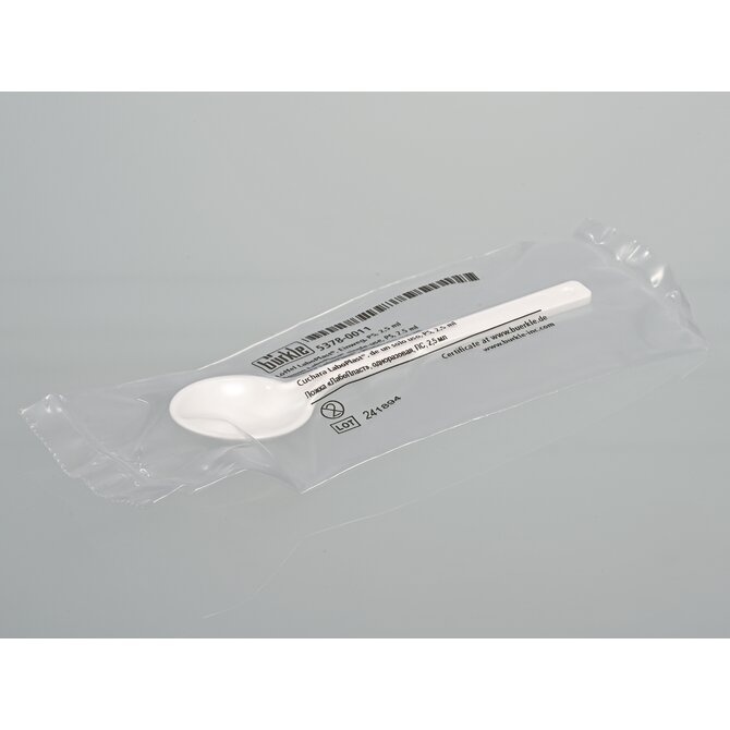The spoon for foodstuffs is available in two sizes, 2.5 ml (similar to a teaspoon) and 10 ml (similar to a tablespoon), and is ideal for sampling powders, granulates, pastes and fluids.