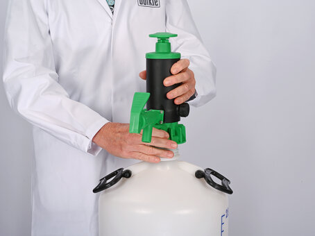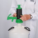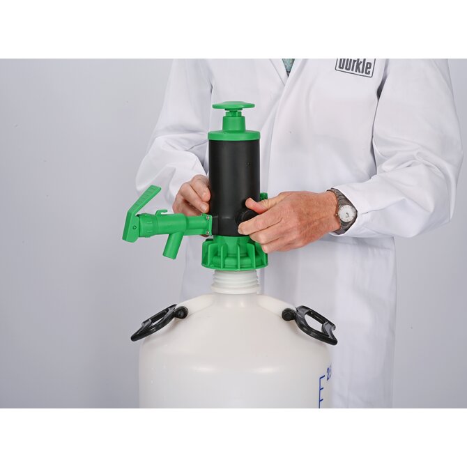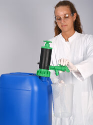 The PumpMaster in green for filling and dosing acids and chemical liquids is equipped with high-quality FKM seals. Ideal for the safe handling of light acids and other chemicals.