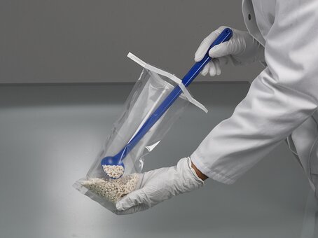 The sampling scoop can be used to take samples of powders, granulates and pastes. The long handle makes it possible to sample larger containers even with little content or to reach through narrow openings.