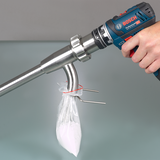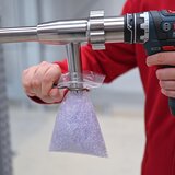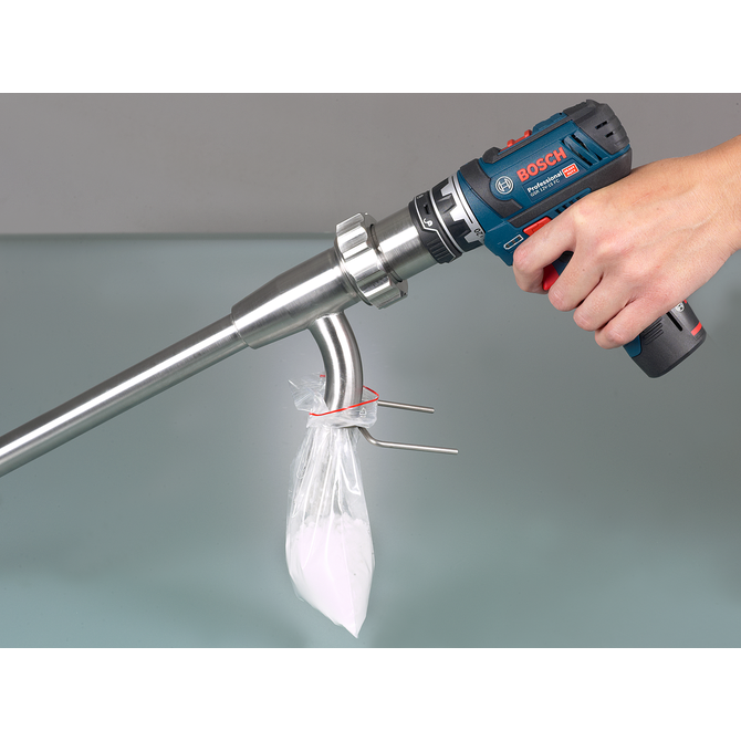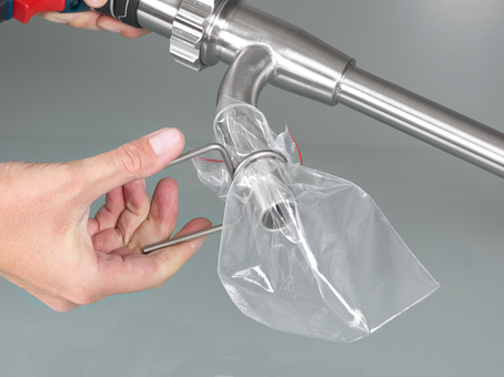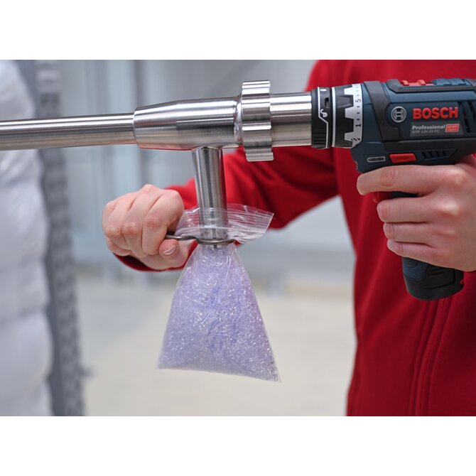 Suitable for filling sterile disposable sample bags for environmental or food sampling. The clamp attaches to the sampler or a holding rod and secures the bag—for example, under a stream of solid material or at a dispensing spout. This makes it easy to fill powders, granulates, or liquids into bags without needing a second person—ideal for laboratory and production settings where samples need to be collected safely and without contact.