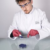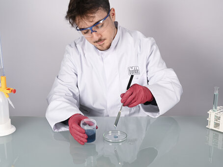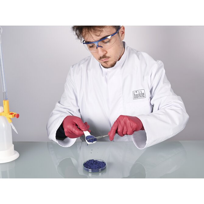 In chemical laboratories and biotechnological facilities, the rounded side of the double spatula is ideal for removing sensitive samples from beakers and reaction vessels without scratching them.