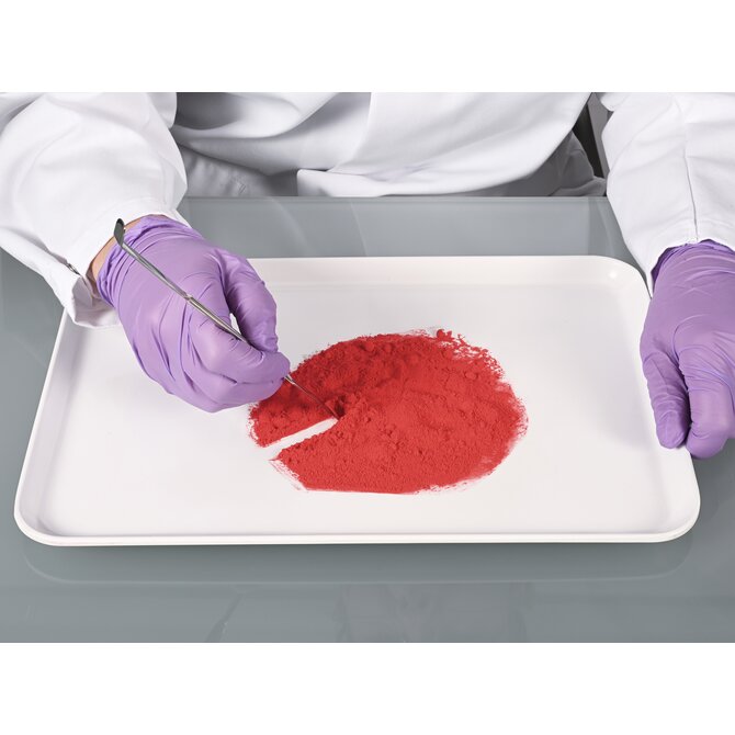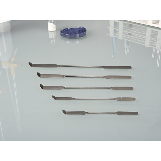 The Chattaway square/round curved double spatula is ideal for tasks requiring precision and ergonomics. In instrumental analysis, for instance, the square side is used to accurately measure fine-grained solids and transfer them to measuring vessels or analysis vials. The curved, round side is used to remove samples from round-bottomed flasks, beakers, and other difficult-to-access vessels during sample preparation. The curvature of the spatula adapts to the shape of the vessel, preventing scratches and reducing material loss. In microbiology or histology, the ergonomic angle makes it easier to scrape residues from Petri dishes or centrifuge tubes without straining your hand. It ensures smooth processes and precise results during repetitive dispensing work. The spatula proves its functionality in a wide range of application scenarios, whether in research, laboratory routine, or medical diagnostics.