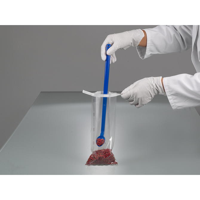The sampling spoon with long handle can be used to remove powders, granulates, pastes or liquids.