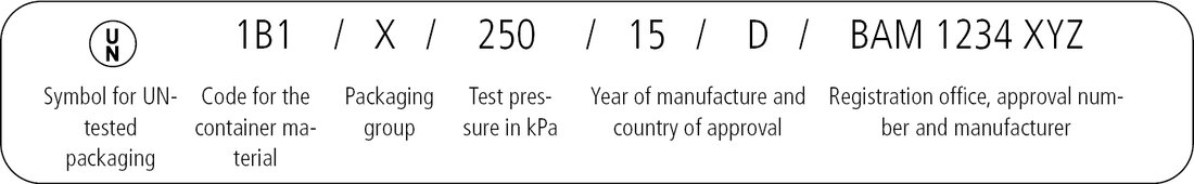 The identification contains the symbol for UN-tested packaging, the code for the container material, packaging group, test pressure in kPa, year of manufacture, country of approval, registration office, approval number and manufacturer.