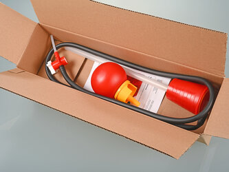 The OTAL® foot pump with hose and stopcock is flexible and space-saving. The 1.5 m (4.92 ft.) long adaptable PVC hose allows flexible positioning of the filling container. The stopcock made of PP/PE enables precise dosing and prevents overflow.