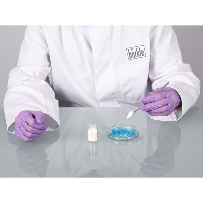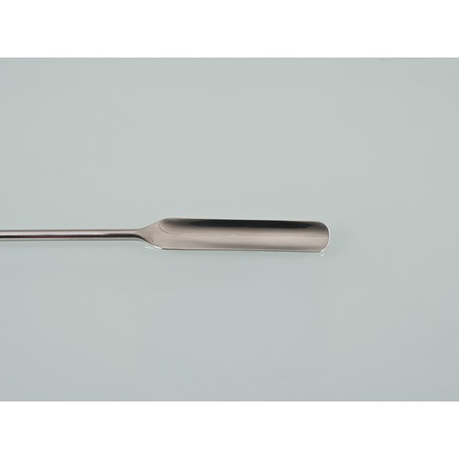 The micro spatula can be used for reliably measuring, sampling or processing small amounts of powder, chemicals, pastes, creams or active ingredients. The laboratory scoop is made of stainless steel and is manufactured entirely without edges, crevices or undercuts. This excludes the possibility of impurities or cross-contamination, since no product residue or cleaning agents can be deposited.