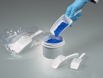 The LaboPlast® Bio disposable scoop made of green PE is produced in our clean room of class 7 (10,000) and individually packaged in bio-PE film for disposable use.