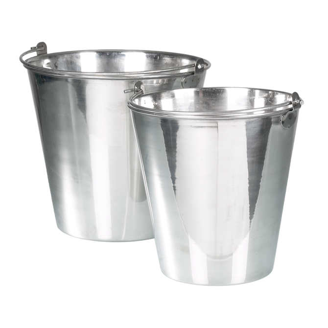 Industrial bucket for transporting, decanting and mixing. Safe emptying with wide spout. Handle made of metal.