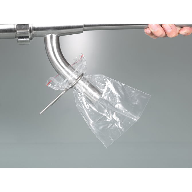 La pinza de sujeción mantiene firmemente las bolsas de muestreo con una abertura de Ø 25 mm en dispositivos de muestreo como StickProof o PowderProof. La pinza garantiza que la bolsa permanezca abierta y no se desplace durante el proceso de muestreo. Normalmente se fija a un soporte o a un mango. La bolsa de muestreo se sujeta de tal manera que los líquidos o polvos pueden introducirse directamente, sin necesidad de sostener la bolsa con la mano, lo que permite una toma de muestras cómoda y libre de contaminación.
