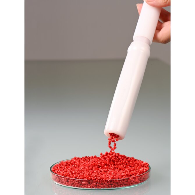 El TargetDispo permite coger una muestra en un punto específico del material previamente determinado. El colector penetra cerrado en el polvo o en el granulado, y solo cuando se ha llegado al punto de extracción, se abre y se vuelve a cerrar. De esta manera, se toma una muestra exactamente del punto deseado. La muestra se puede vaciar fácilmente por la empuñadura abierta.