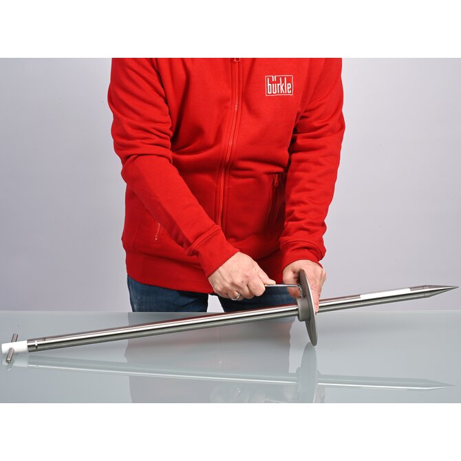 Para que un procedimiento de muestreo sea reproducible, debe realizarse siempre en las mismas condiciones. El tope de profundidad para muestreadores es un accesorio útil para este fin. El tope de profundidad se fija al tomamuestras a cualquier altura mediante un tornillo de apriete en C. De este modo se garantiza que el tomamuestras penetre en el fondo de la muestra. De este modo se garantiza que el muestreador penetre a la misma profundidad deseada cada vez que se inserte. La profundidad de penetración queda así fijada y puede registrarse con precisión en un informe de ensayo o en las instrucciones de muestreo, por ejemplo. El tope de profundidad también puede evitar la perforación involuntaria durante la toma de muestras.