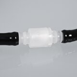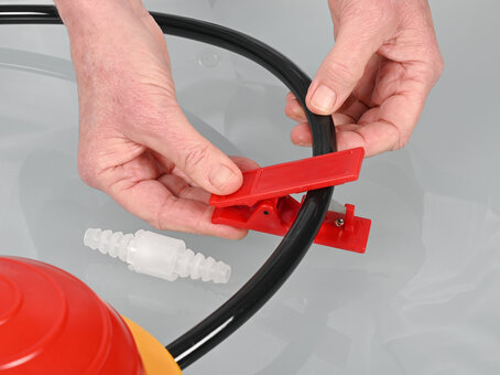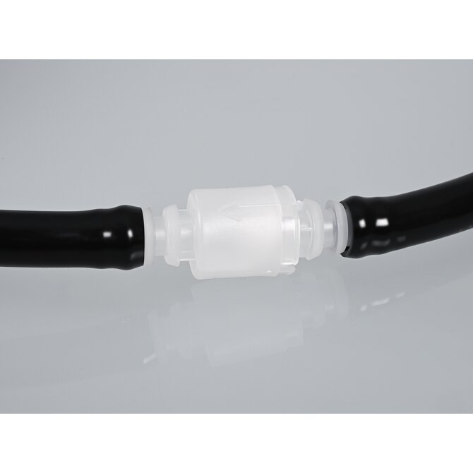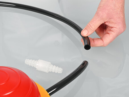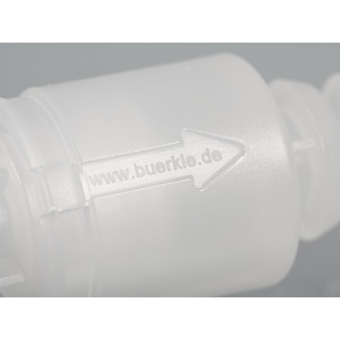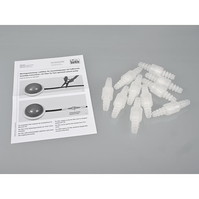 Filtre pour le flexible à air de la pompe à solvant à commande à pied, protège le milieu de transvasement des particules de poussière qui pourraient s'introduire par la pompe à air. Ainsi, il est possible de réaliser un transvasement particulièrement pur.