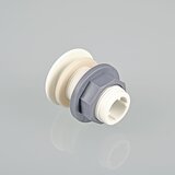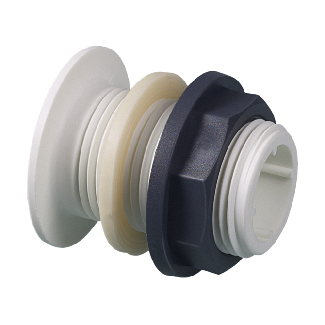 Raccordo per contenitori con filettatura esterna, completo di guarnizioni in EPDM, per un facile montaggio della filettatura nei lati dei contenitori.