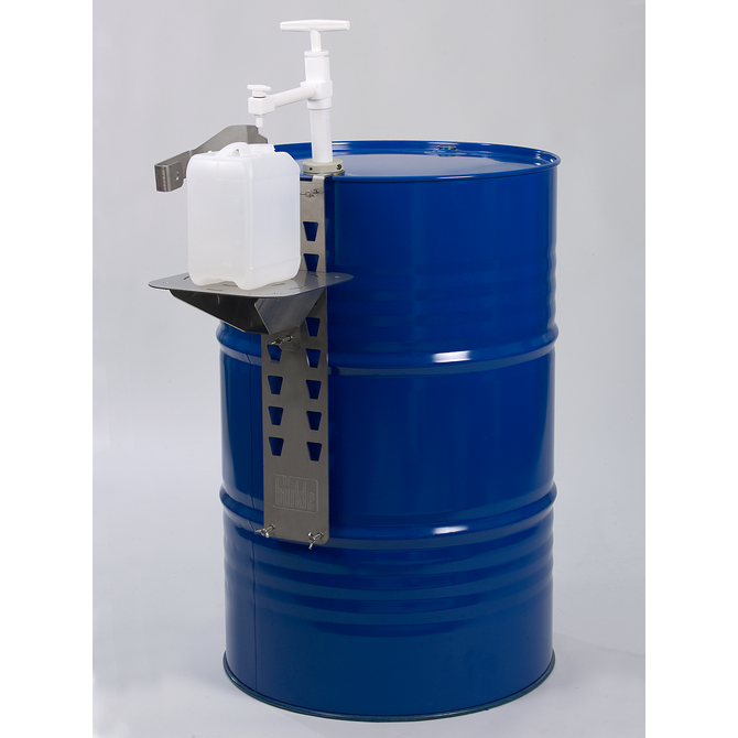 Il supporto può essere utilizzato per le pompe Bürkle con gomito di scarico o tubo di scarico. I tubi di scarico possono essere facilmente inseriti nel supporto incernierato. Adatto a tutti i fusti in plastica e acciaio inox da 60 litri a 220 litri con un'altezza minima del bordo di 10 mm.