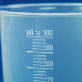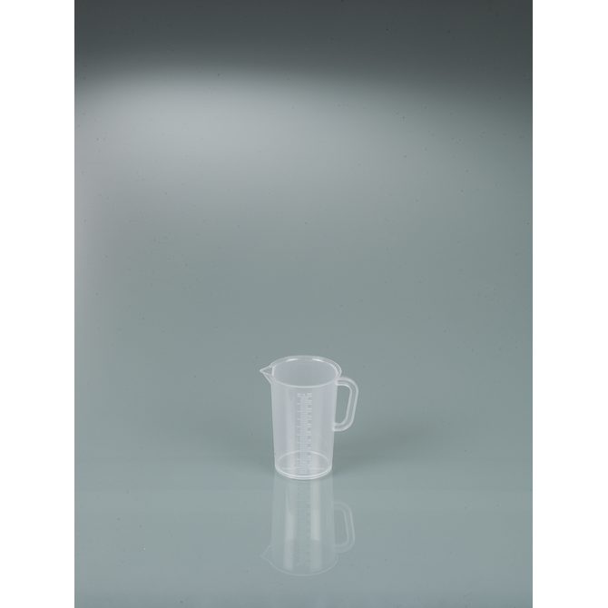 Bicchiere graduato con graduazione stampata in blu, manico aperto, conico. I becher possono essere impilati e quindi consentono di risparmiare spazio durante lo stoccaggio.