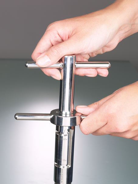 La profondità di immersione della lancia di campionamento è facilmente leggibile sulla scala di profondità incisa al laser. La punta arrotondata evita di graffiare il contenitore. Due maniglie aggiuntive garantiscono un inserimento, un fissaggio e una rotazione sicuri nel materiale. Gli inserti di precisione impediscono la miscelazione dei materiali e consentono un facile smontaggio per una pulizia accurata.
