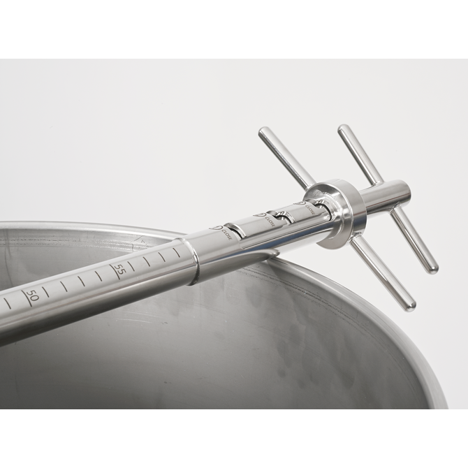La profondità di immersione della lancia di campionamento è facilmente leggibile grazie a una scala di profondità incisa al laser. La punta arrotondata impedisce di graffiare il contenitore. Due maniglie aggiuntive garantiscono l'inserimento, il fissaggio e la rotazione del materiale in tutta sicurezza. Gli inserti di precisione impediscono la miscelazione del materiale e consentono un facile smontaggio per una pulizia accurata.