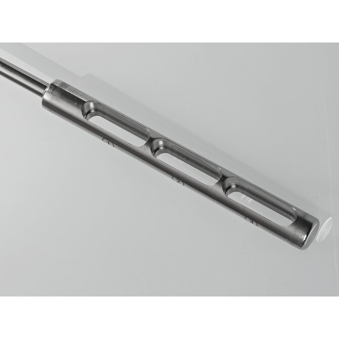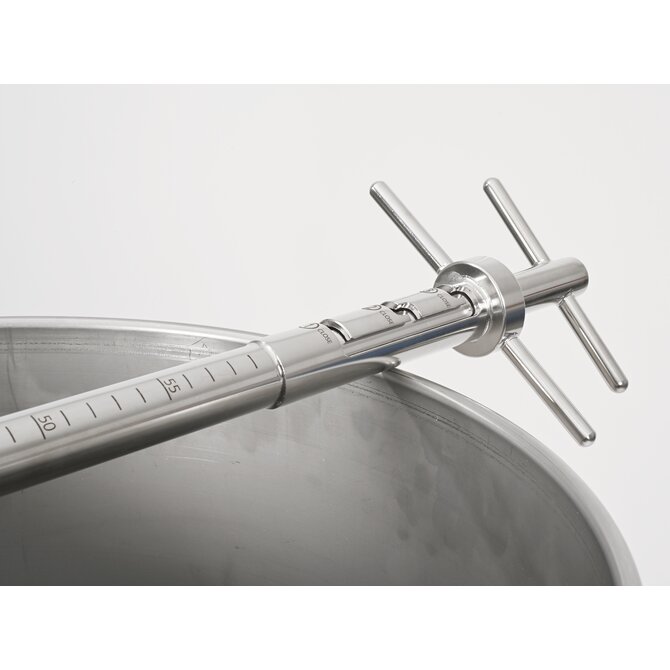 La profondità di immersione della lancia di campionamento è facilmente leggibile grazie a una scala di profondità incisa al laser. La punta arrotondata impedisce di graffiare il contenitore. Due maniglie aggiuntive garantiscono l'inserimento, il fissaggio e la rotazione del materiale in tutta sicurezza. Gli inserti di precisione impediscono la miscelazione del materiale e consentono un facile smontaggio per una pulizia accurata.