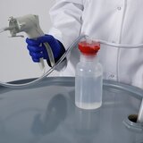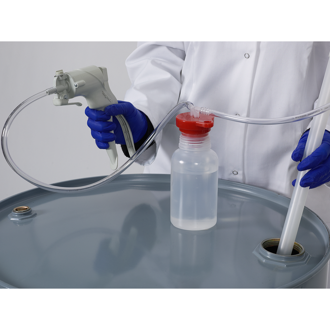 Campionatore per campioni di liquidi da una profondità esattamente predeterminata, con pompa per vuoto manuale. Il campionamento con pompa a vuoto ha il vantaggio che il liquido entra in contatto solo con il tubo di aspirazione e con la bottiglia di campione originale.