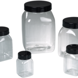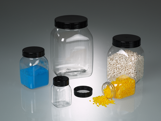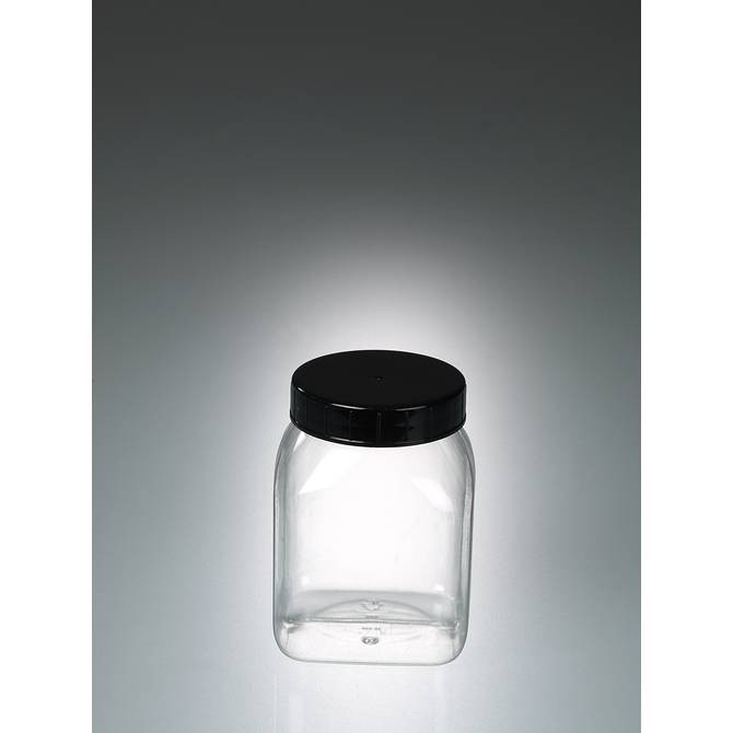 - Barattolo a bocca larga, quadrato, PETG e tappo a vite nero con inserto in schiuma