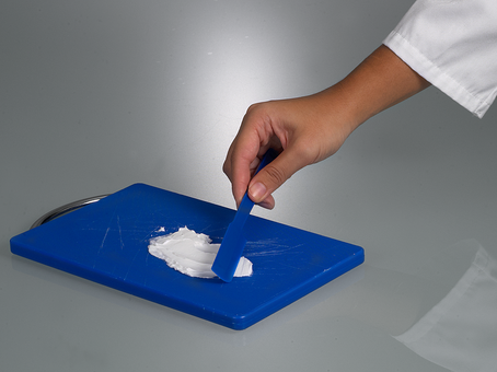 プラスチック製スクレーパーの寸法的に安定した長いエッジは、粘性のある媒体の切断に最適です。長辺の小さな先端は、例えば包装フィルムの破断に使用できます。スクレーパーは攪拌や混合にも適しています。