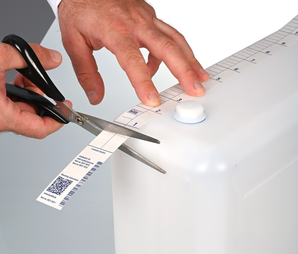 目盛りは自己吸着式で、ジェリカンのどこにでも貼り付けることができます。ただし、注ぎ口の側面に取り付けることをお勧めします。