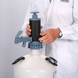 - Wytwórz nadciśnienie powietrza w zbiorniku, uruchamiając tłok ręczny. Naciśnij dźwignię zaworu dozującego w dół: Medium zaczyna płynąć. Zwolnij dźwignię: Przepływ zostaje przerwany. Aby uzyskać swobodny, ciągły przepływ, pociągnij dźwignię do przodu i zablokuj ją. Natężenie przepływu można zmniejszyć, wkładając dyszę redukcyjną do zaworu dozującego.