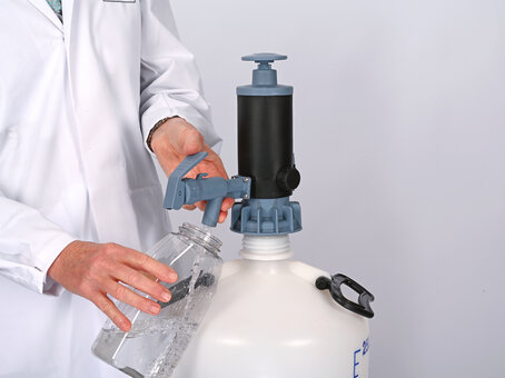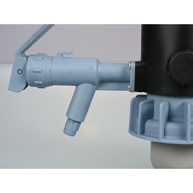 Zintegrowany kran pompy PumpMaster umożliwia precyzyjne dozowanie cieczy. Kran można obsługiwać w celu dozowania cieczy w sposób ukierunkowany lub można go otworzyć w celu przepływu, składając go do przodu.
