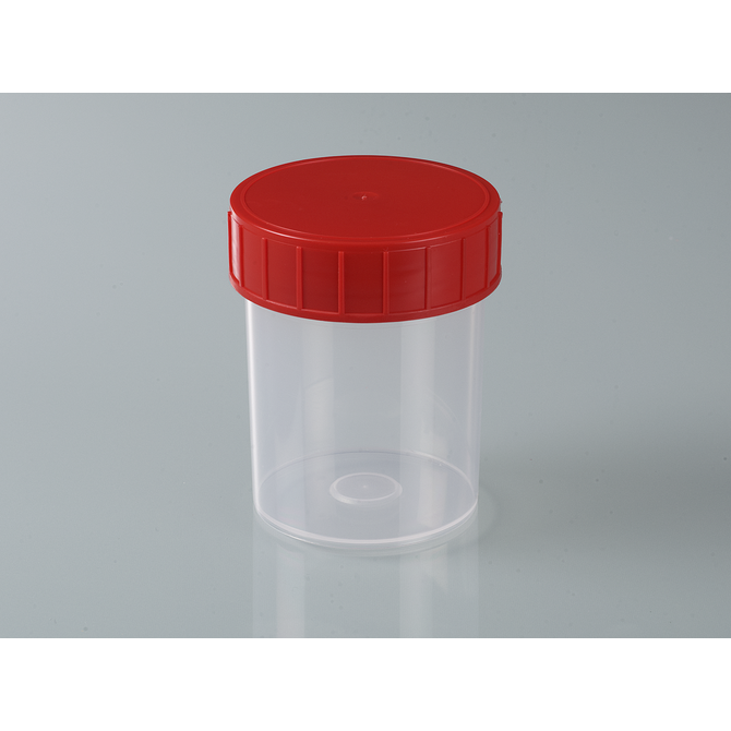 Caixa de amostras com tampa de rosca. Ideal para coleta e transporte de amostras. Esvaziamento sem resíduos porque não há fendas.