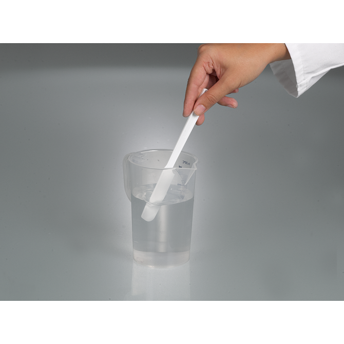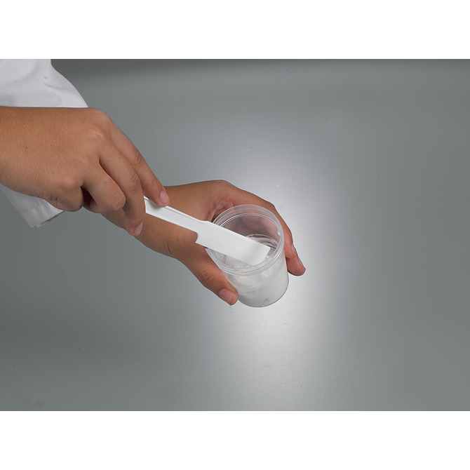 O cabo longo facilita o acesso ao fundo de recipientes maiores e permite a coleta de amostras em tambores, galões e garrafas com diâmetros de abertura pequenos. Graças às reentrâncias no cabo, a colher descartável repousa de forma confortável e segura na mão.