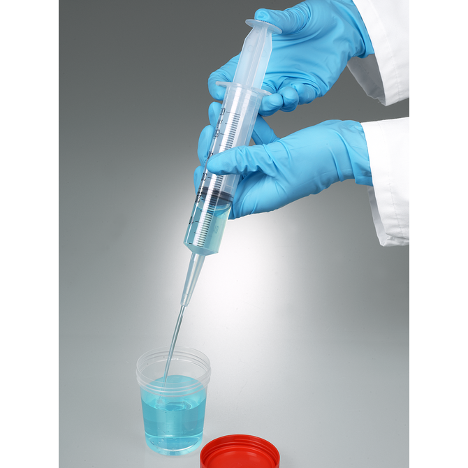 A seringa é fornecida em uma embalagem estéril e está pronta para uso imediato. A seringa pode ser estendida para qualquer comprimento com tubos adicionais. Um adaptador Luer é fornecido para a seringa de 100 ml.