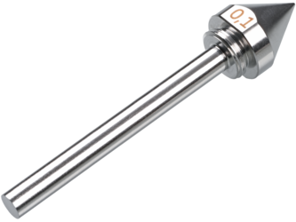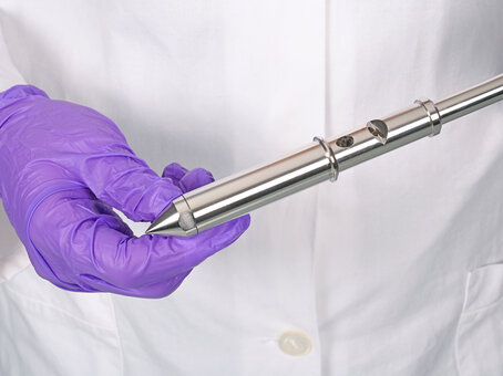 A câmara de coleta é o cilindro de entrada de amostras do sistema PharmaPicker. A ponteira de volume correspondente é inserida na parte frontal dessa câmara de aço inoxidável. Quando inserida no pó, a ponteira se enche; ao ser retirada, o volume da amostra permanece na câmara de coleta.