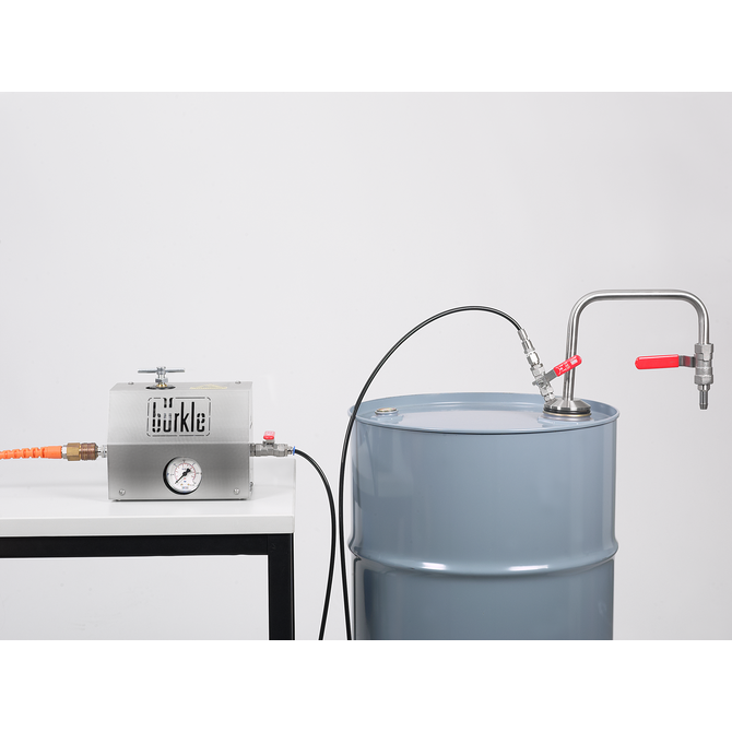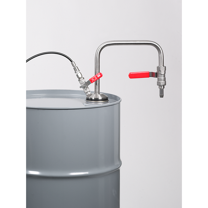 A bomba é facilmente fixada ao contentor através de uma ligação roscada de barril. Pode ser ligada a ar comprimido ou azoto (3-10 bar) através de uma fonte de ar móvel ou estacionária.