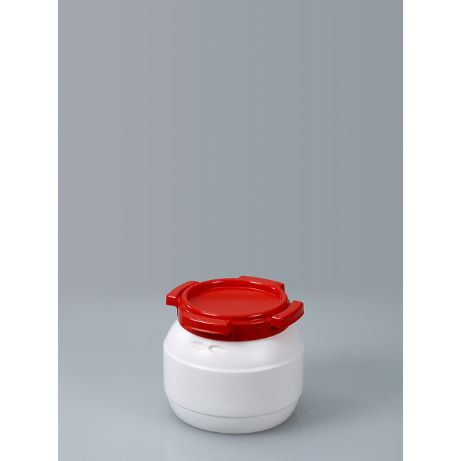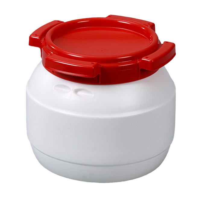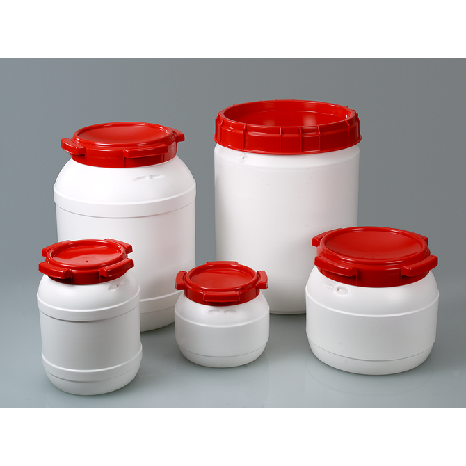 Recipiente de gargalo largo para eliminação ou armazenamento de pós, granulados e líquidos. Pode ser fechado hermeticamente e selado. Os contentores têm uma aprovação de transporte da ONU para sólidos.