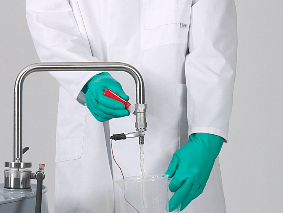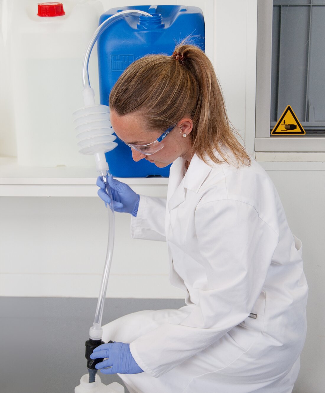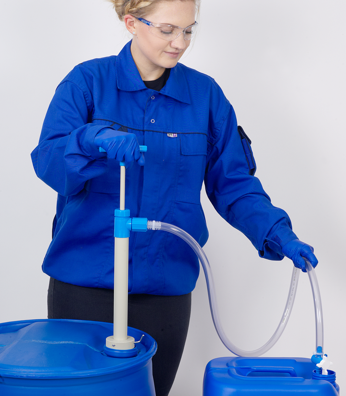 A Bürkle oferece muitas bombas de plástico com tubos de descarga rígidos e também com tubos de descarga e válvula de fecho para encher recipientes que se encontram mais longe ou mais acima. Ao manusear líquidos corrosivos ou agressivos, o utilizador deve tomar as devidas precauções. O vestuário de proteção, como luvas, óculos de proteção, aventais e máscaras faciais, é essencial.