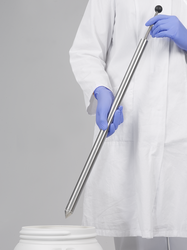 Amostrador para pó na área farmacêutica, feito de aço inoxidável AISI 316L, material 1.4404. A ponta especialmente fina pode ser inserida fácil e profundamente para recolher a amostra. A entrada cónica da ponta permite a recolha de quantidades muito pequenas ou grandes. O StickProof é construído numa só peça sem arestas, ranhuras ou fendas para uma limpeza perfeita e fácil. A amostra pode ser introduzida diretamente no saco de recolha de amostras a partir da extremidade de saída. Fixe o saco com uma braçadeira resistente.