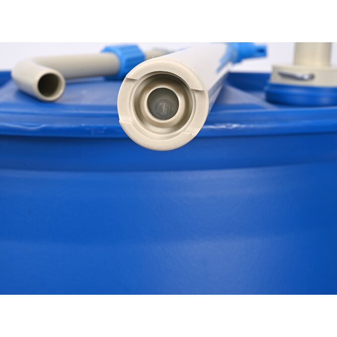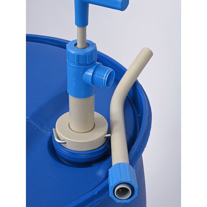 Bomba de barril em PP com mangueira de descarga flexível em PVC, comprimento de 1,2 m e torneira.
